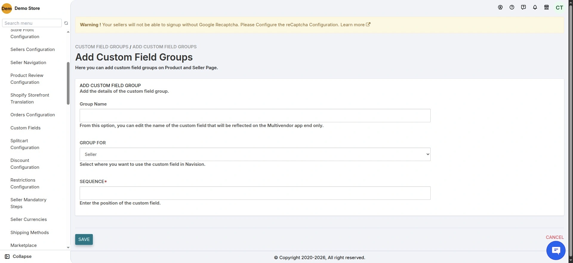 Add the Group Name, select whether it is for Seller or Products, and enter the sequence.