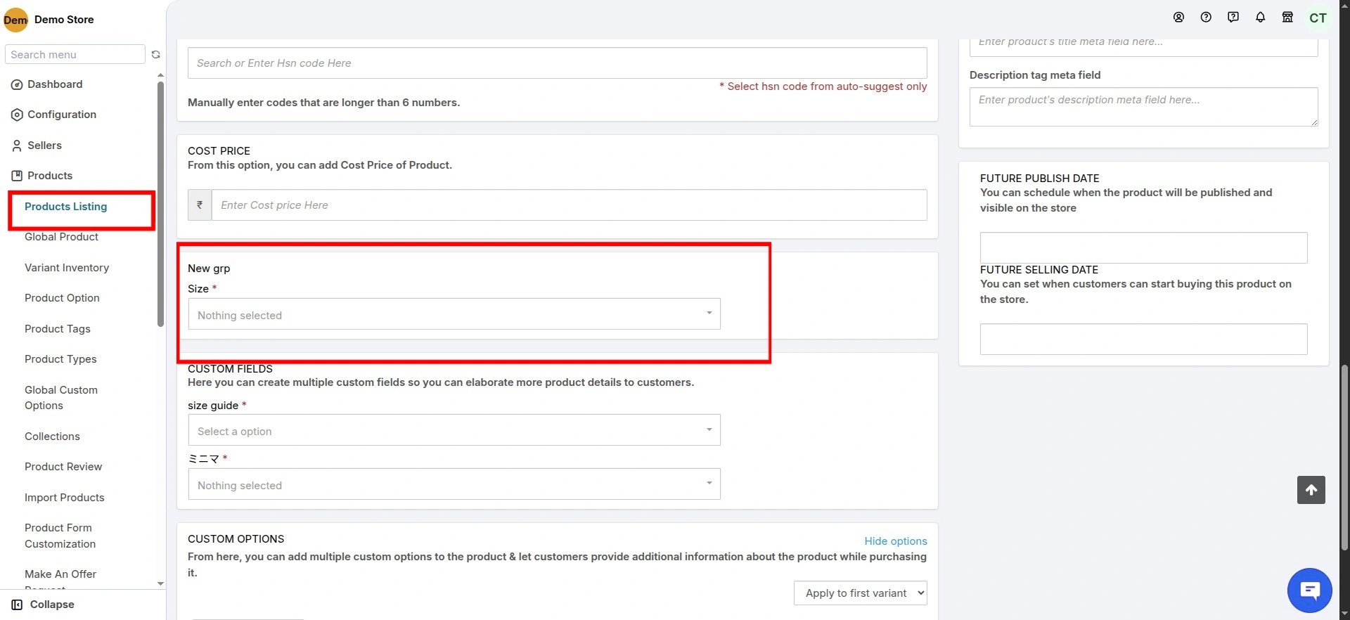 Similarly, the admin can add custom fields for fetching extra information regarding the products from the sellers.