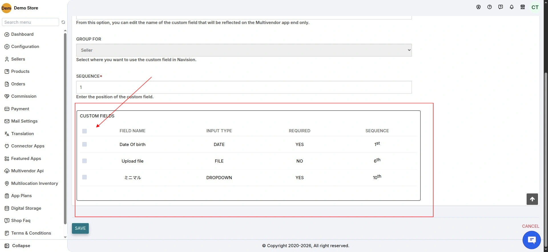 SEQUENCE: Enter the position of the custom field.